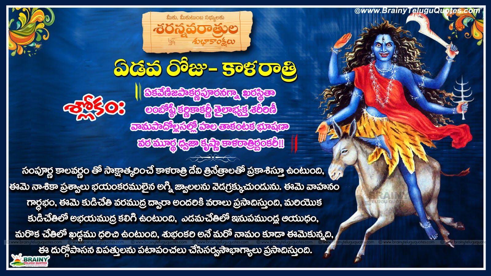 Navratri 7th Day Kalratri Devi Mantra Maa Bheemeshwari Devi ब र व ल म त. With dark black complexion, bountiful hair ma kaalratri is shown riding on a donkey and is depicted with four hands. Ma's right hands are in abhaya and varada mudra and in her two left hands. Mythology says that after a vigorous fight of 9 days the goddess. 2nd day of navratri is an important day of navratri festival, which should be started with puja and reading this year in 2020, second day of navratri is lying on 18th october (sunday). If you are reciting according to the charitras, then you should recite madhyam charitra. Goddess kalaratri rides a donkey and is considered the most aggressive and destructive. On the 7th day of navratri, maa kaalratri, who is the seventh manifestation of maa durga is worshiped. This day people also arrange the utsava maha saptami(7th day) marks the major day of rituals for the goddess of power. Here, kaal means time and death and ratri stands for a night. Second day of navratri festival is dedicated to goddess brahmacharni, who is worshipped on the 2nd day of navratri. The 7th day of navratri is dedicated to maa kaalratri who is one of the fiercest forms of goddess durga and is believed as the destroyer of all bad spirits, ghosts, and negative energies. Same way as the first day's resolution durga shaptashati's recitation should be done;a process is same as explained earlier. Navratri 7th day(maha saptami) observes the worship of goddess kalaratri as well as goddess saraswati. Seventh day of navratri (tuesday, 16 october 2018). The seventh day of navratri is dedicated to goddess kaalratri.